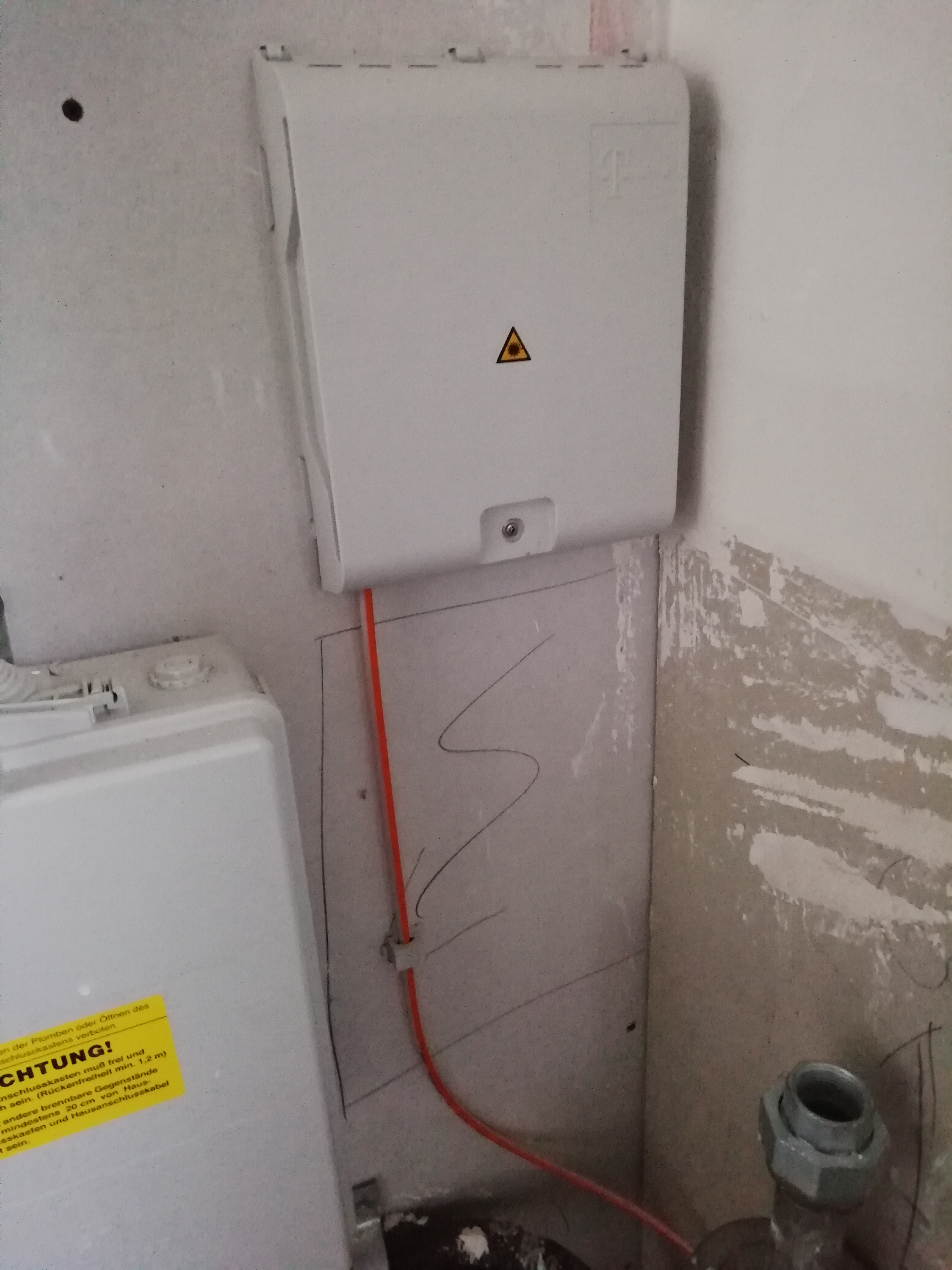 Auch die Glasfaser wurde zwischenzeitlich in das Orange Schutzröhrchen (die Speed-Pipe) eingeblasen und der Anschlusskasten im Haus montiert. Theoretisch könnten wir ab jetzt einen Internet-Tarif bei der Telekom buchen und mit bis zu 1GBit/s im Downstream surfen.