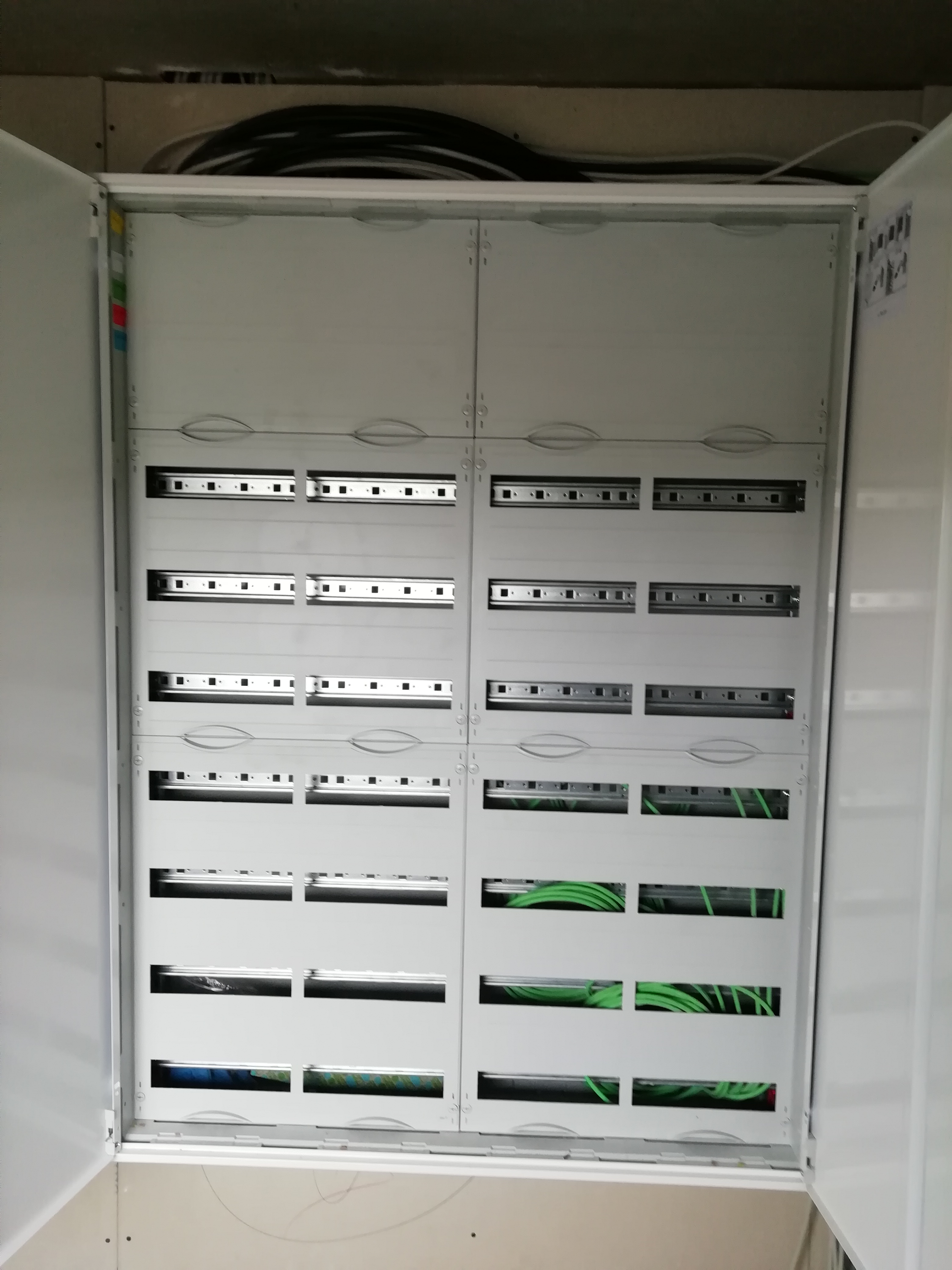 Dafür kann sich aber das Endergebnis sehen lassen. Alle Kabel für Verbraucher und Lampen (bis auf Heizung, Herd und Backofen) sind auf Reihenklemmen aufgelegt und bereit mit der KNX-Aktorik verbunden zu werden. Die Kiste steht hier auch schon einige Wochen in der Mietwohnung und wartet auf den Einbau. Allerdings haben wir hier vom Elektriker die Empfehlung bekommen die Estrich-Aufheiz-Phase, und somit die Zeit mit extremer Luftfeuchtigkeit im Haus, abzuwarten, damit die Komponenten nicht korrodieren oder sonstwie durch die Feuchtigkeit Schaden nehmen. Wenn es soweit ist, werde die Aktoren und KNX-Systemgeräte in den vorgesehenen Schächten verbaut.