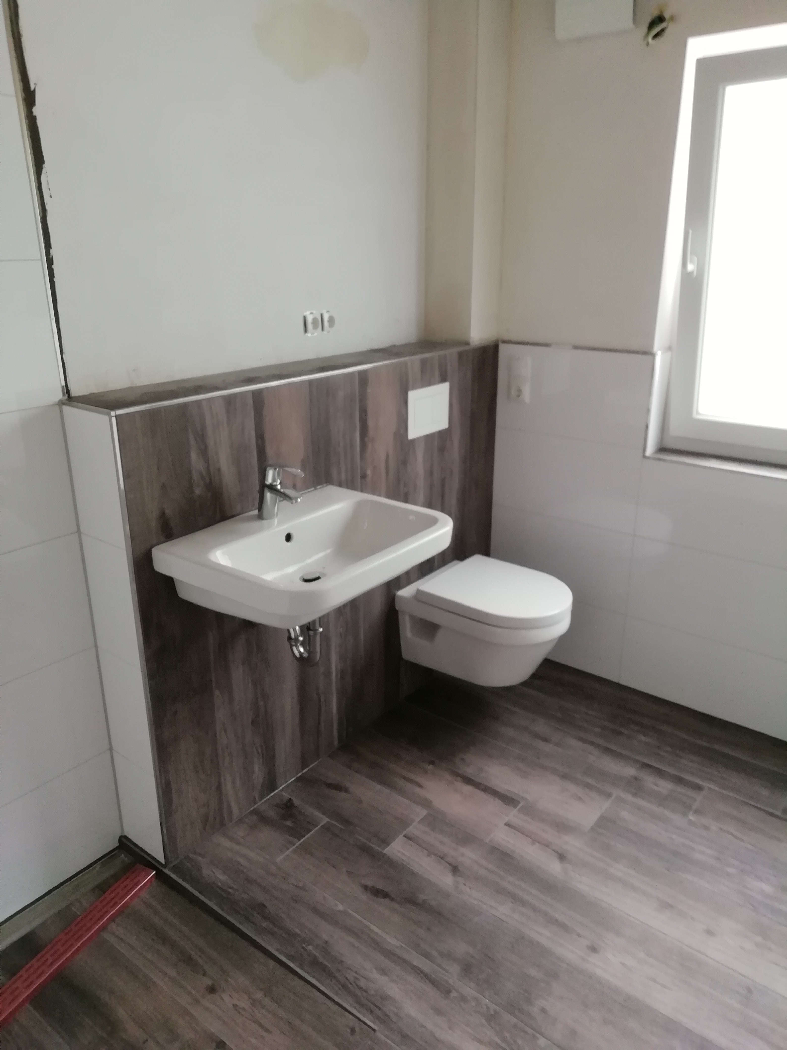Bad EG - Die Macke in der Badewanne, welche durch eine aus der Hand gerutschte Fliese entstanden ist, wurde beseitigt und auch sonst ist das Bad im OG fertig (wenn auch noch nicht gereinigt).